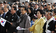 1일 제91주년 3.1절 기념식 참석을 위해 충남 천안 독립기념관을 찾은 이명박 대통령과 부인 김윤옥 여사가 함께 각각 청록색과 노란색의 고운 한복 차림으로 등장해 눈길을 끌었다.이 대통령 내외 뿐 아니라 윤진식 정책실장, 박재완 국정기획, 박형준 정무, 이동관 홍보수