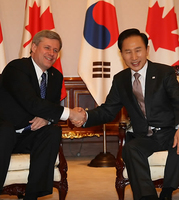 이명박 대통령은 7일 캐나다산 쇠고기 수입 문제와 관련, "한국 국민들에게 (쇠고기 문제는) 매우 예민한 문제가 있기 때문에 WTO(세계무역기구)에서 현재 프로세스 중"이라고 전제를 제시했다. 이 대통령은 이날 청와대에서 스티븐 하퍼 호주 총리와 정상회담을 가진 뒤 공