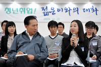 이명박 대통령은 29일 청년취업 문제와 관련, "정부와 기업이 노력하는 걸로만 될 것이 아니라 젊은이들의 직업관을 되돌아볼 필요가 있다"고 말했다. 청년실업이 사회적 문제로 떠오르고 있지만 중소기업에는 인력이 모자라는 소위 '구인·구직 미스매치' 현상에 대한 지적이다.