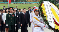 베트남을 국빈 방문중인 이명박 대통령은 21일 하노이 시내 호치민 묘소를 방문하고 헌화했다.이날 오전 이 대통령은 검정색 양복과 어두운 빛의 자주색 넥타이를 착용하고 호치민 묘소에 도착했다. 이 대통령은 묘소 입구 왼쪽에 놓인 화환앞에 1,2초간 멈춰 화환의 리본을 만