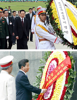 이명박 대통령과 노무현 전 대통령의 호치민 묘소 방문이 여러 면에서 대조를 이뤄 눈길을 끌고 있다.베트남을 국빈 방문중인 이 대통령은 21일 오전 하노이 시내 호치민 묘소를 찾아 헌화했다. 화환을 앞세우고 묘소 입구까지 걸어간 이 대통령은 묘소 입구 왼쪽에 놓인 화환앞