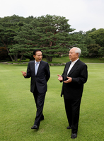 이명박 대통령은 23일 청와대 상춘재에서 정진석 서울대교구장 추기경과 오찬을 함께 하며 국정 현안에 대해 폭넓게 의견을 교환했다. 이명박 대통령은 23일 청와대 상춘재에서 정진석 서울대교구장 추기경과 오찬을 함께 하며 환담했다. 이날 회동은 배석자 없이 12시부터 약