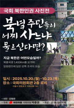박충권 국민의힘 의원이 주최하고 사단법인 통일한국이 주관하는 '북한인권 사진전'이 오는 20일부터 23일까지 국회의원회관 2층 로비에서 진행된다.이번 전시는 이재명 정부의 북한 인권 문제 외면을 비판하고, 북한 주민들의 열악한 삶을 알리기 위해 마련됐다. 최근