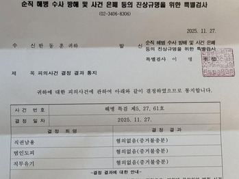 한동훈 전 국민의힘 대표가 자신에게 적용된 모든 혐의를 '증거 불충분'으로 무혐의 처리한 순직해병특검팀(특별검사 이명현)을 겨냥해 "정치특검의 결말"이라고 비판했다.1일 정치권에 따르면, 한 전 대표는 전날 자신의 페이스북에 순직해병특검의 '피의사건 결정 결과 통지서'