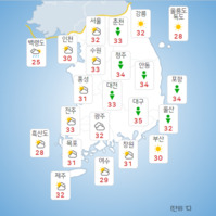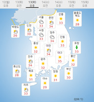 [오늘의 날씨] 전국 낮 기온 32℃ 이상 올라… 일부 지역, 낮시간 내내 소나기