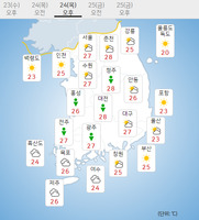 목요일인 24일, 전국이 구름 많겠고 곳곳에 소나기가 내리겠다.이날 전국은 중국 산둥반도 부근에 위치한 고기압의 가장자리에 들겠다. 이날도 전날에 이어 대기 불안정의 이유로 소나기가 예보됐다.수도권과 강원내륙 및 산지·충청권·전라권·경북 내륙·경남 서부 내륙·제주도 산