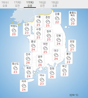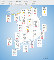 수요일인 16일, 전국이 대체로 흐리고 일부 지역은 비가 내리겠다.이날 중부지방은 동해상에 위치한 고기압의 가장자리에 들겠으나, 남부지방과 제주도는 저기압 영향에서 차차 벗어나겠다. 이날은 또 전날부터 내린 비가 이어지겠다.호남 지역은 새벽까지, 영남은 오전까