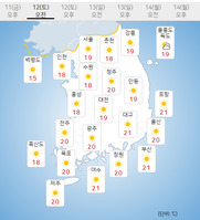 토요일인 12일, 전국이 대체로 맑겠으나 낮부터 남부내륙과 강원 영서는 가끔 구름 많겠다.이날 전국은 서해상에 위치한 고기압의 가장자리에 들겠다. 이날은 또 대기 불안정에 의한 소나기도 예보됐다. 오후 3시부터 9시 사이 전북 동부에는 대기 불안정에 의한 소나기가 예보