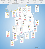 금요일인 28일, 중부지방은 대체로 흐리고 남부지방은 대체로 맑다가 오전부터 흐려지겠다.이날 전국은 발해만 부근에서 동진하는 저기압의 영향을 받다가 벗어나겠다. 기압골에 의한 강수도 예보됐다. 이날 오전 3시, 수도권에서부터 시작된 비는 낮 동안 전국 대부분