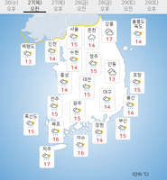 수요일인 26일, 중부지방과 전북·경북권은 대체로 맑다가 밤부터 차차 흐려지겠다. 수도권과 강원 영서는 구름이 많겠고 비가 조금 오는 곳이 있겠다.이날 전국은 남해상에서 동진하는 고기압의 가장자리에 들겠고, 오후부터 남부지방은 서쪽에서 접근하는 기압골의 영향을 차차 받