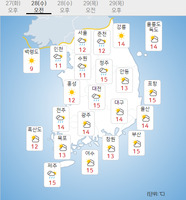 수요일인 28일은 전국이 가끔 구름 많은 가운데, 중국발 황사의 영향을 받겠다.이날 전국은 중국 상해 부근에서 다가오는 기압골의 영향을 벗어나는 대신, 중국 산둥반도 부근에서 동진하는 고기압의 영향을 받겠다. 기압골에 의한 강수도 예보됐다. 오전 6시까지 수도