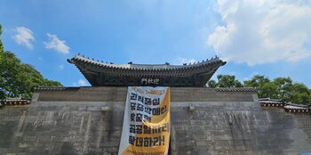 경복궁 영추문에 올라 '현수막 시위' 전장연 활동가 체포