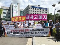 전국민주노동조합총연맹(민노총) 소속 전국교직원노동조합(전교조) 서울지부 등 50여 개 좌파 단체들이 8일 자율형사립고등학교(자사고) 폐지를 촉구하는 공동 집회를 열었다. 서울지역 자사고 재지정 평가 결과 발표일(9일)을 하루 앞둔 상황에서 서울시교육청을 압박하기 위한