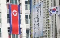 강릉선수촌 北숙소 덮은 '초대형 인공기'..대한민국 숙소 외벽엔?