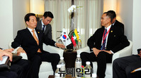 [포토] 제3차 아세안 확대 국방장관회의(ADMM-Plus)에 참석하기 위해 말레이시아 쿠알라룸푸르를 방문중인 한민구 국방장관(왼쪽)이 3일 미얀마 세인 윈 국방부 장관과 대담을 나누고 있다.…
