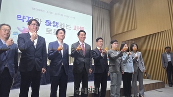 오세훈 서울특별시장이 19일 주재한 '약자와 동행하는 서울 토론회'에 김문수 국민의힘 대선 후보와 이준석 개혁신당 대선 후보가 나란히 참석했다. 지난 18일 대선 주자 첫 TV토론회에서 이재명 더불어민주당 대선 후보를 향해 함께 공세를 펼쳤던 김 후보와 이 후