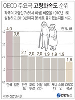 한국이 지난 40여 년 동안 우리나라 인구의 고령화 속도가 경제협력개발기구(OECD) 회원국 중 가장 빠른 것으로 나타났다. 9일 산업연구원에 따르면 OECD 34개 회원국의 인구구조를 비교, 분석한 결과 한국의 고령인구(65세 이상) 비중은 12.2%로 30위에 머물