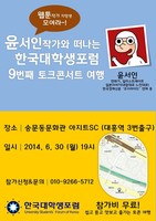 한국대학생포럼(이하 한 대포)이 윤서인 만화가와 함께 웹툰작가를 꿈꾸는 학생들을 응원하는 ‘윤서인작가와 떠나는 9번째 토크콘서트 여행’을 개최한다. 오는 30일 오후 7시 숭문동문화관 아지트SC에서 열리는 이번행사는 ▲1부 웹툰작가로써 살아온 윤서인의 삶 ▲2부 컨텐츠