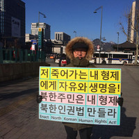 올겨울 들어 가장 춥다는 모두 두 손을 주머니에 집어 넣은채총총 걸음으로 주위도 둘러보지 않은 채거리를 지나가는 28일 오후.서울 광화문 동아일보 앞에는 국회에 계류돼 있는 북한인권법 통과를 위해(대표 인지연)이 나서사진 인증을 통한 1인시위 캠페인이 진행중이다.북한인