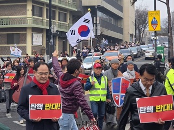 [영상] "尹 복귀 확신" … 국민의힘·국민변호인단, 헌재 앞서 '인간 띠' 행진