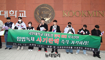 국민대 재학생들과 졸업생들은 12일 서울 성북구 국민대 정문 앞에서 '대통령 탄핵 반대 시국선언'을 열고 헌법재판관들을 향해 윤석열 대통령에 대한 탄핵소추안을 기각할 것을 촉구했다.이들은 더불어민주당의 정부 고위급 인사에 대한 '줄 탄핵', 주적인 북한과의 관계 강화,