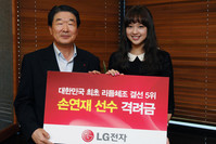 LG전자는 23일 끊임없는 노력과 열정으로 한국 리듬체조의 새로운 역사를 쓴 손연재 선수에게 격려금을 전달했다고 밝혔다.LG전자 구본준 부회장은 이날 서울 여의도 LG트윈타워에서 역대 최고의 성과를 거둔 ‘체조 요정’ 손연재 선수에게 격려금과 최신 울트라북 노트북 1대