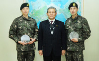 병무청(청장 김영후)은 16일 제8대 병무홍보대사로 활동해 온 국방부 근무지원단 소속 이동곤(예명 이동건), 김보석(예명 김지석) 병장에게 감사패를 수여했다고 밝혔다.
