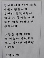 주차 뺑소니범의 편지가 화제를 모으고 있다.최근 한 온라인 커뮤니티 게시판에는 주차 뺑소니범의 편지가 게재돼 눈길을 끌고 있다.편지에는 “주차하려다 당신 차를 손상시켰습니다. 주변의 목격자들이 지금 이 쪽지를 쓰고 있는 저를 바라보고 있습니다. 그들은 분명 제가 제 이