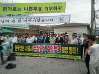 종북좌익척결단, 나라사랑실천운동 등 우파 시민단체 회원들이 민주당의 주민투표 불참운동을 규탄하는 공동 기자회견을 열었다.19일 오전 서울 민주당사 앞에서 열린 이 날 집회에서 회원들은 "반민주적이고 불법적인 주민투표 불참운동을 중단하라"며 민주당을 강도높게 질타했다.회