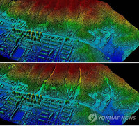 국토해양부 국토지리연구원은 중부지역을 강타한 폭우로 산사태 피해가 발생한 지역의 항공사진을 16일 공개했다. 사진은 서울 우면산을 항공레이더로 촬영한 것으로 위 사진은 2009년 8월, 아래는 산사태 이후인 2011년 8월 모습.아래 사진에는 산사태가 할퀴고 간 산의
