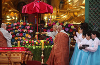 불기 2555년 부처님 오신날인 10일 서울 조계사에서 봉축 법요식이 봉행됐다.오전 10시부터 열린 법요식은 중생을 깨우치기 위해 북과 종을 울리는 명고와 명종을 시작으로 조계종 총무원장 자승 스님의 봉축사와 조계종 최고 어른인 종정 법전 스님의 법어로 이어졌다.이날