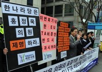 바른사회시민회의 등 시민단체들이 한·EU FTA비준안 표결에 기권한 홍정욱 의원의 제명을 촉구했다.바른사회시민회의 등 시민단체들은 18일 서울 여의도 한나라당사 앞에서 기자회견을 열고 "지난 15일 홍 의원의 기권행위는 국익을 저버린 무책임의 소산이자 개인 인기영합의