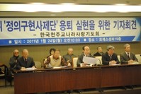 "정진석 추기경을 환영하는 현수막 대신 박정희 대통령 암살범인 김재규를 열사 추대하는 신부를 '신부님'이라 할 수 있는가? 순진한 교우들을 선동하지 마라" 24일 서울 중구 프레스센타에서 천주교 나라사랑기도회 등 평신도 40여명이 정의구현사제단의 용퇴를 촉구하는 기자회