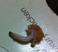통큰치킨의 판매 중단이 프랜차이즈 업계의 가격거품 논란으로 번진 가운데 유명 업체 A사의 치킨에서 애벌레가 발견됐다는 주장이 제기됐다. 해당사진은 지난 12일 한 네티즌이 인터넷 포털사이트 엠엘비파크 게시판 등에 올리면서 16일 각종 온라인 커뮤니티로 번지기 시작했다.