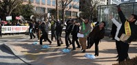 5일낮 국회의사당 앞에서 창녕군민 500여명이 피켓을 들고 고함치며 시위하던 현장 한쪽 횡단보도앞에 일부 시민들이 모여들어 비취색 포대…
