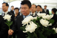 함장 최원일 중령을 비롯한 천안함 생존 승조원들이 26일 밤 평택 해군 2함대사령부에 마련된 '천안함 46용사' 합동분향소를 찾아 단체로 조문했다. 생존 승조원 58명 중 52명은 천안함 침몰시간인 '26일 오후 9시22분'에 맞춰 합동분향소를 찾아 1시간이 넘