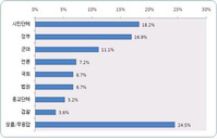 주요기관 신뢰도 조사에서 정부 신뢰도가 크게 상승한 반면 시민단체 신뢰도는 낮아진 것으로 조사됐다. 리얼미터(대표 이택수)가 주요 기관에 대한 신뢰도를 조사한 결과, 시민단체가 지난해에 이어 18.2%로 1위를 지켰으나 지난해 42.3%에서 신뢰도가 크게 줄어든 것으로