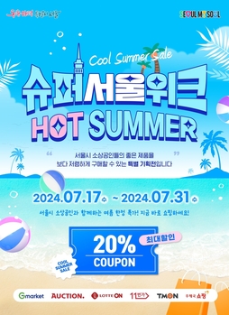 서울시가 오는 17일부터 31일까지 국내 온라인 쇼핑몰 6곳에서 소상공인의 제품을 최대 20% 할인된 가격으로 구매할 수 있는 '슈퍼서울위크 핫썸머'를 진행한다고 15일 밝혔다.이번 기획전은 ▲G마켓 ▲옥션 ▲롯데온 ▲11번가 ▲티몬 ▲우체국쇼핑 등 국내 대표 온라인