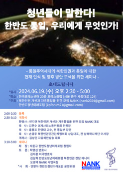 북한의 오물풍선 살포로 남북 간 군사적 긴장감이 고조되고 있는 가운데 MZ세대 청년들이 모여 북한인권과 한반도 통일을 논의하는 장이 열린다. 북한인권 개선과 자유통일을 위한 모임 NANK(대표 인지연)(이하 NANK)와 북한인권 및 통일의 선도적인 청년단체인