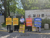 '비언론노조' 계열인 MBC노동조합이 3일 오전 서울 종로구 감사원 정문 앞에서 MBC 대주주 방송문화진흥회(방문진)와 권태선 방문진 이사장을 규탄하는 집회를 열었다. 이날 감사원이 권태선 이사장을 MBC의 방만 경영을 관리·감독하지 않았다는 이유로 소환한 가운데 MB