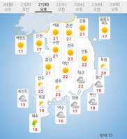 화요일인 21일은 낮 최고기온이 20도가 넘어 포근하겠다.중부지방은 가끔 구름이 많겠고 남부지방과 제주도는 대체로 흐리겠다.제주도는 가끔 비가 내리고, 남해안은 빗방울이 떨어지는 곳이 있겠다.예상 강수량은 제주도 5∼10㎜, 남해안 0.1㎜ 미만이다.아침 최저기온은 -