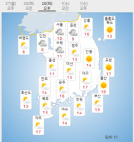화요일인 28일은 비교적 포근한 기온 분포를 보이는 가운데 일교차가 크겠다.아침 최저기온은 -6∼6도, 낮 최고기온은 8∼17도로 예보됐다.낮 기온은 평년(최고기온 7∼12도)보다 높고 27일(8∼16도)과 비슷하겠다.다만, 내륙을 중심으로 낮과 밤의 기온 차가 15도