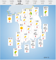 목요일인 16일은 전국이 대체로 흐린 가운데 제주 일부 지역에는 비 또는 눈이 오겠다.수도권과 강원 영서·충남 서해안에는 낮부터 오후 사이 0.1㎝ 미만의 눈이 날리거나 0.1㎜ 미만의 빗방울이 떨어지는 곳이 있겠다.제주도에는 낮까지 가끔 비 또는 눈이 오는 곳이 있겠