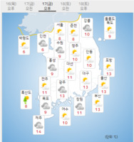 금요일인 17일은 전국에 구름이 많은 가운데 중부지방을 중심으로 미세먼지 농도가 높겠다.아침 최저기온은 -6∼4도, 낮 최고기온은 6∼13도로 예보됐다. 낮부터 기온이 오르면서 18일까지 평년보다 2∼5도가량 높겠다.중부지역 대부분은 국외 미세먼지가 유입되고, 대기 정