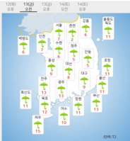 금요일인 13일 전국이 흐리고 비가 내리겠다.12∼13일 기준 예상 강수량은 제주도(북부 해안 제외), 전남 동부 남해안, 경남권 남해안·지리산 부근 30∼80㎜다.전남권(동부 남해안·지리산 부근 제외), 경남권(남해안·지리산 부근 제외), 제주도 북부 해안은 20∼6