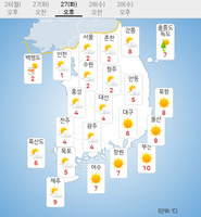 화요일인 27일은 전국이 매우 춥겠다. 동해안과 일부 경상권을 제외한 전국 대부분 지역에 눈이 쌓여있는 가운데, 눈이 얼어 도로가 매우 미끄럽겠다. 동해안에는 너울이 강하게 밀려오겠고, 새벽부터 오전 사이 내륙을 중심으로 안개가 끼는 곳이 있겠다.&n