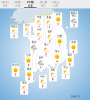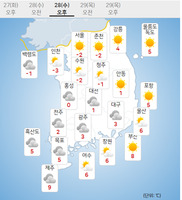 수요일인 28일은 전국에 구름이 많은 가운데 중부지방을 중심으로 곳곳에 눈이 내리겠다.새벽부터 아침 사이 수도권과 강원 내륙·산지, 충청권에 한때 1㎝ 미만의 눈이 쌓이겠다. 충남 서해안과 전라 서해안에도 가끔 눈이 오겠다.아침 최저기온은 -12∼1도, 낮 최고기온은