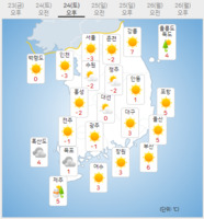크리스마스 이브이자 토요일인 24일은 전국이 대체로 맑은 가운데 강추위가 이어지겠다.충남권, 전라권, 제주도에는 구름이 많겠다.아침 최저기온은 -20∼-2도, 낮 최고기온은 -4∼7도로 예보됐다. 서울은 아침 기온이 -13도까지 떨어지겠다.예상 적설량은 충남 남부 서해