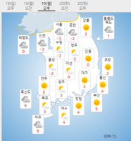 화요일인 20일은 전국이 대체로 맑다가 밤부터 차차 흐려지겠다.아침 최저기온은 -16∼0도, 낮 최고기온은 1∼10도로 예보됐다. 낮부터 강추위가 다소 약해지면서 서울을 비롯한 대부분 지역의 기온이 영상권을 회복하겠다.바다의 물결은 동해 앞바다에서 0.5∼1.5m, 서