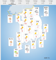 토요일인 17일도 강추위가 이어지는 가운데 곳곳에 눈발이 날리겠다.충남권과 전라권을 중심으로 새벽부터 밤사이 많은 눈이 내리겠고, 제주도에도 비나 눈이 오겠다.수도권과 강원 영서 지역에는 오전 중, 충북과 경상 서부 내륙은 오후까지 곳곳에 눈이 내리겠다.예상 적설량은
